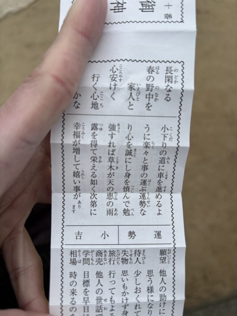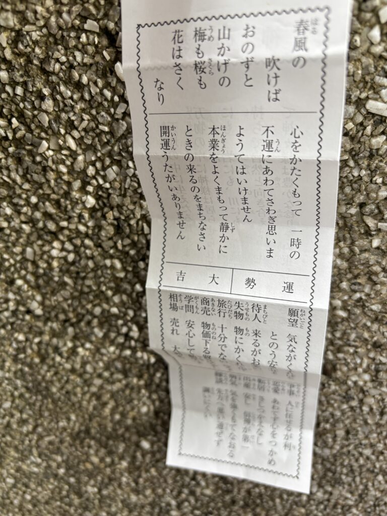 残念ながらお昼に行った時は友人は不在っぽかったので2礼2拍手1礼しておみくじだけ引かしていただきました。